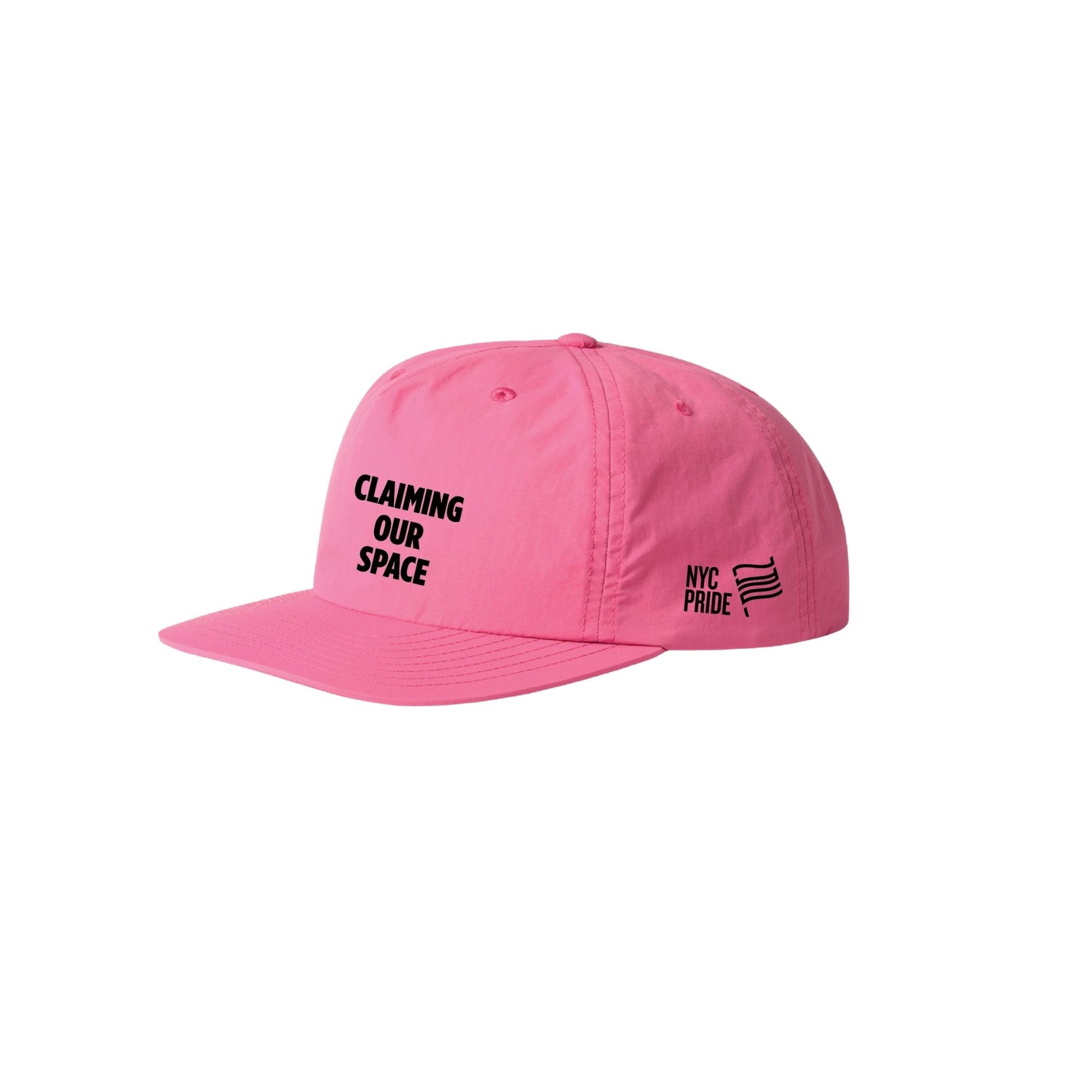 Claim your space with this pink surf cap crafted from lightweight, quick-dry 100% recycled nylon. This mid-profile, unstructured snapback features a single front panel and a practical plastic snapback closure, ideal for versatile outdoor wear. Claiming Our Space embroidery is featured at the front and the NYC Pride official logo is embroidered on the side.